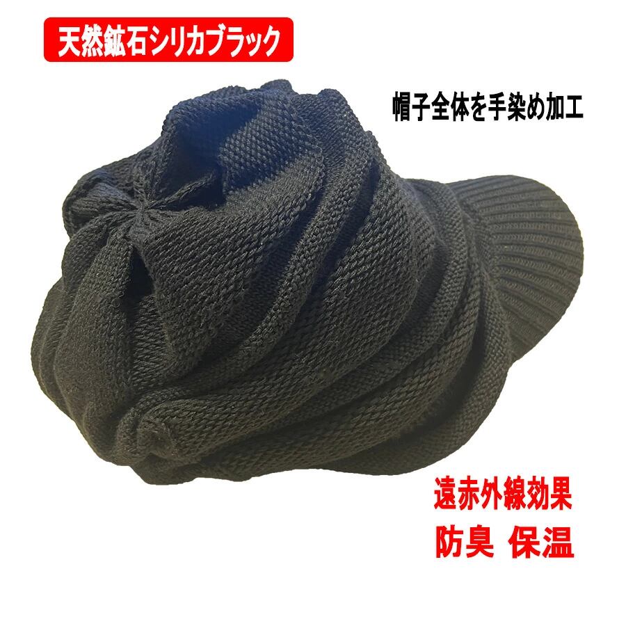 ニット帽全体を天然鉱石シリカブラックにて手染め加工しております。遠赤外線・岩盤浴のニット帽です(一年中快適を保ってくれる天然の遠赤効果)。自宅で洗濯できます。電磁波過敏症の方にも喜ばれています。