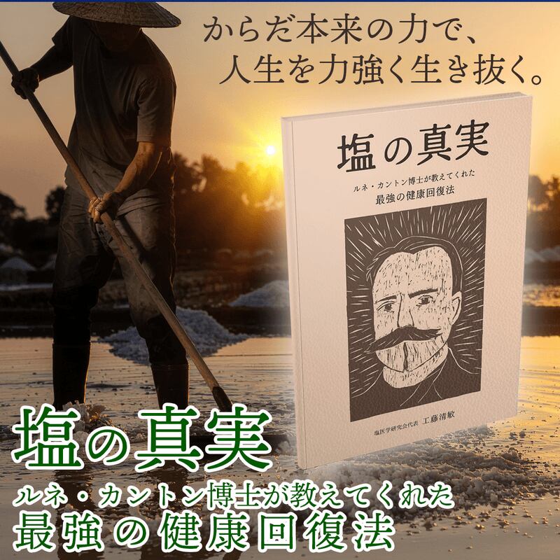 「減塩」は本当に健康的?工藤清敏氏が語る自然塩の真実と、ミネラルが身体の自然治癒力を引き出す仕組みを解説した書籍です。斜視・認知症・アトピー・高血圧など23の実例付き。